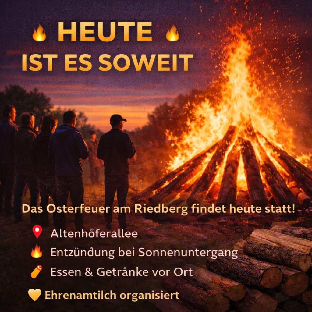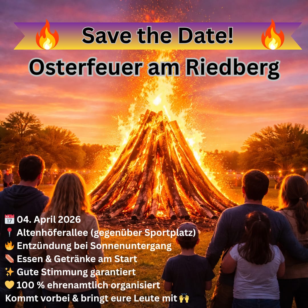 Die IG Riedberg e. V. lädt am 4. April 2026 zum traditionellen Osterfeuer gegenüber dem Sportplatz Altenhöferallee ein, um gemeinsam einen geselligen, ehrenamtlich organisierten Abend zu verbringen.
