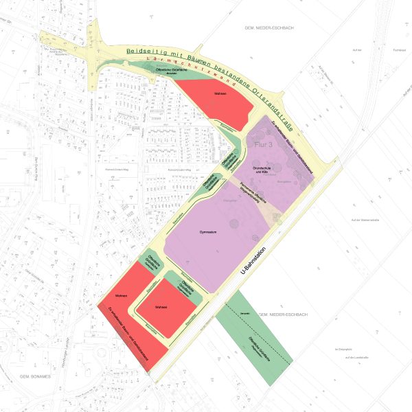 – da ebenfalls drei- bis viergeschossiger Wohnungsbau vorgesehen ist (auf der Karte in rot), ist ein zusätzlicher Bedarf an Betreuungsplätzen für Kinder m Vorschulalter absehbar: eine auf dem Schulgelände integrierte Kindertagesstätte soll dem gerecht werden.