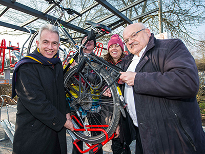 Oberbuergermeister Peter Feldmann und Verkehrsdezernent Klaus Oesterling eroeffnen am Donnerstag (08.02.2018) die Fahrradabstellanlage in Frankfurt-Kalbach. V.l.: Peter Feldmann, Bertram Giebeler (adfc), Carolin Friedrich (Ortsvorsteherin), Klaus Oesterling.