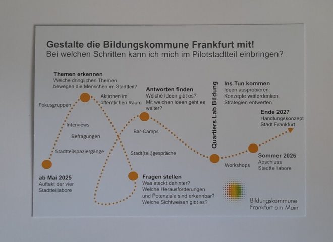 Künftige Aktionstage im Oktober stehen bereits. Das interkulturelle Erntedankfest am 5. Oktober soll dem Wunsch nach mehr Bilingualität und interkultureller Vernetzung nachkommen. Das für Mitte Oktober geplante Gesprächskonzert mit den Bridges Ensembles reizt nicht nur die Ohren, sondern erläutert auch Hintergründe zur vorgetragenen Musik. Das Projekt „Bildungskommune“ selbst läuft noch bis Dezember 2027. Nach den ersten öffentlichen Aktionen und Reflexionsrunden ist für die kommenden Monate die Erarbeitung konkreter Maßnahmen geplant. Weitere Infos gibt es auf der Website https://frankfurt.de/bildungskommune/. Die Ergebnisse der Stadtteillabore lassen sich unter https://frankfurt.de/bildungskommune/bibliothek/dokumentationen/stadtteillabore abrufen.
